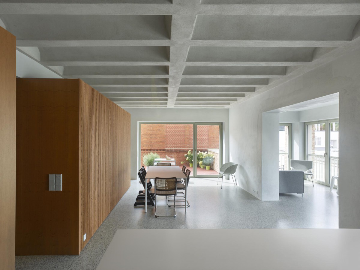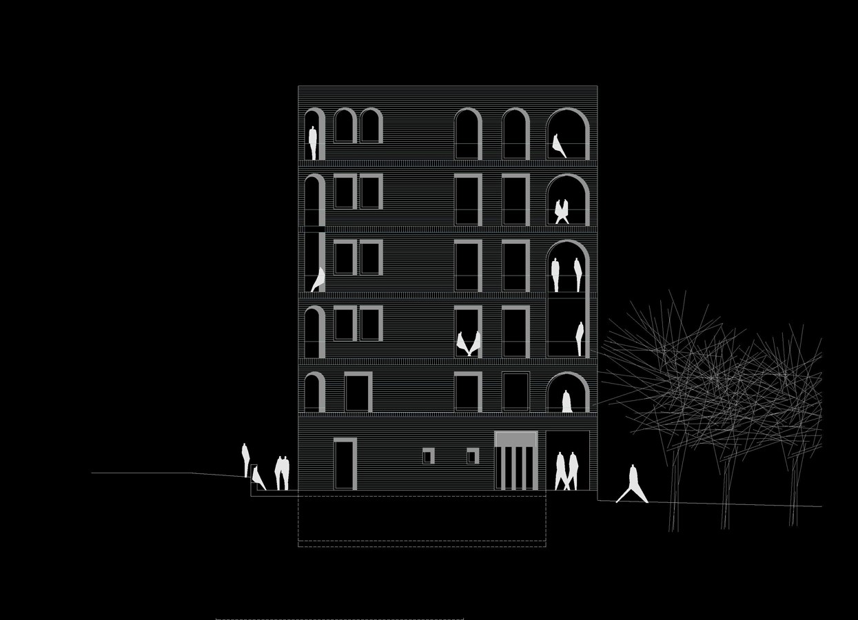 Ein Organismus, der in den Innenräumen und Fassaden die Inhalte von Fabrikatmosphäre weiterträgt und modernes Wohnen Ziegelmural und transparent widerspiegelt.