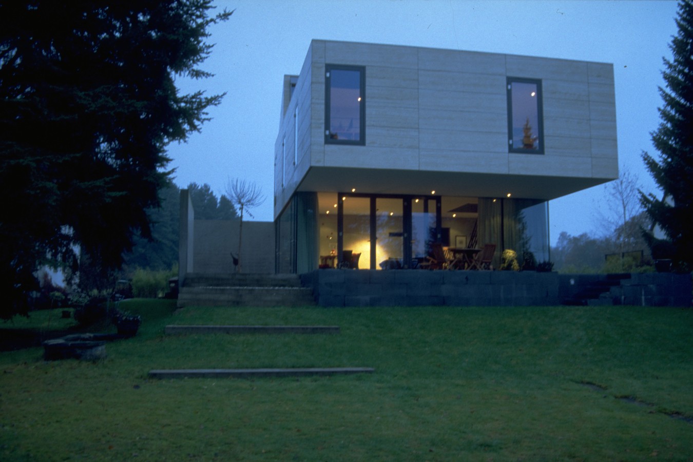 in das konzept einer siedlungsbebauung der 50er jahre wird das haus reiner als murales gebäude integriert und aus diesem entwickelt. sockelausbildung, quadratischer grundriss im erdgeschoss, materialtrennung in der fassade von erdgeschoss zu obergeschoss, firstbetonung, windschutzelemente, sind die prägenden bausteine der bestehenden siedlung und des neuen gebäudes, welches in seinem formalen ausdruck und in bezug auf raum bearbeitet wurde. auf dem bestehenden keller wird das neue gebäude geplant. es werden drei baukörper gebildet , den sockel aus schwarzem schiefer als plateau, erhobene basisfläche mit den treppenausschnitten in das gelände hinein, die erdgeschosspange aus sichtbeton, als wandelemente zur strasse mit nebenräumen und das gebäudeteil mit oberlicht das obergeschoss aus travertin, welches in die gartenfläche hinaus ragt. Im kern der drei baukörper ensteht der eigentliche wohnraum und die terrasse als grundfläche, beschützt und doch offen. die innenräume folgen der konzeption, sodaß im erdgeschoss funktionen und räume entstehen die sich über die basis hinweg in den garten öffnen. und im obergeschoss neben einer gemeinsamen fläche, einzelne räume angeboten sind.