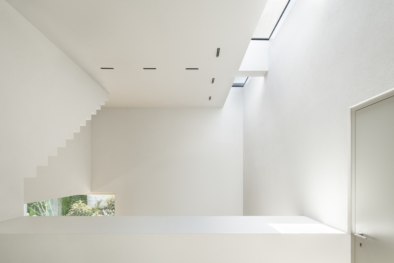 die außenräumlichen kanten und höhen wurden dreidimensional übernommen, die satteldachausbildung als lichtlaterne weitergeführt, die innenräumlichkeiten durch treppen als wegeanlagen und wechsel von verschiedenen raumhöhen als erlebnis realisiert.