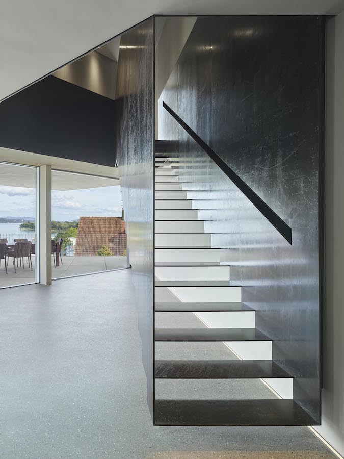 das wohnvolumen auf dem sockel entfaltet sich gedreht entlang der ausblicke auf see und wald. fassaden aus mineralischem kalkputz umschließen die geschosse. im erdgeschoss öffnen sich wohnküchenessbereiche zu terrassen und aussichten. ein gefalteter stahlkörper beinhaltet die treppe und bildet das zentrum. im verdrehten obergeschoss befinden sich die privaten räume, erschlossen über die treppengalerie. ein dachstudio schließt das volumen ab.