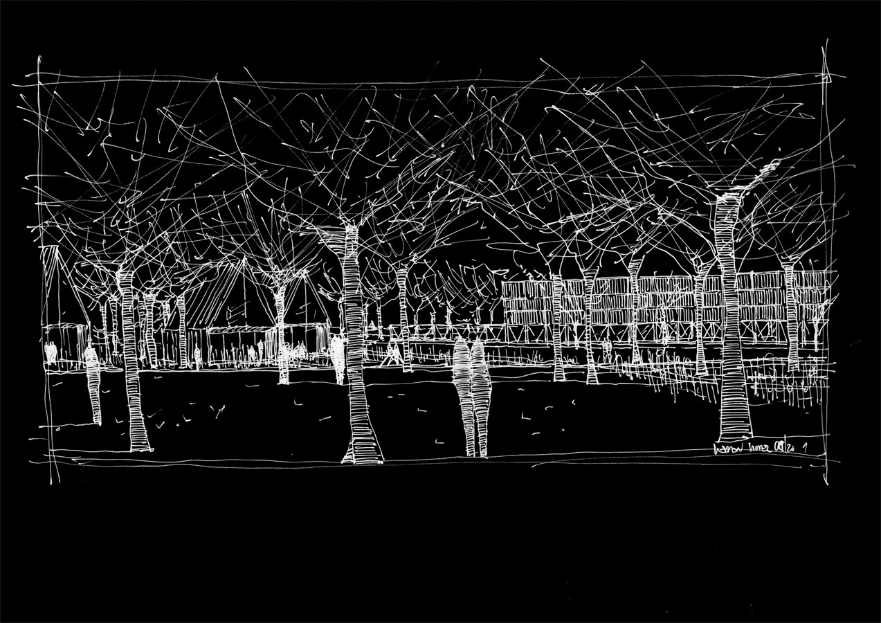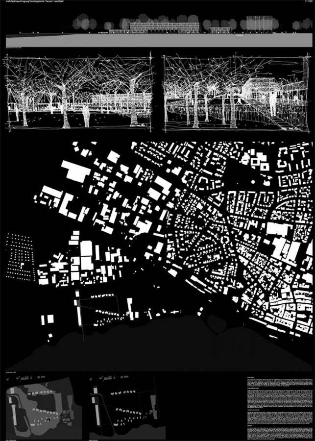 in das wäldchen respektvoll mit dem baumbestand integriert wird ein baumwipfelpfad auf den spuren der trampelpfade eingelegt.