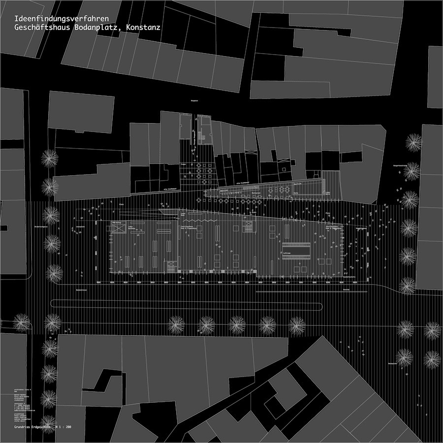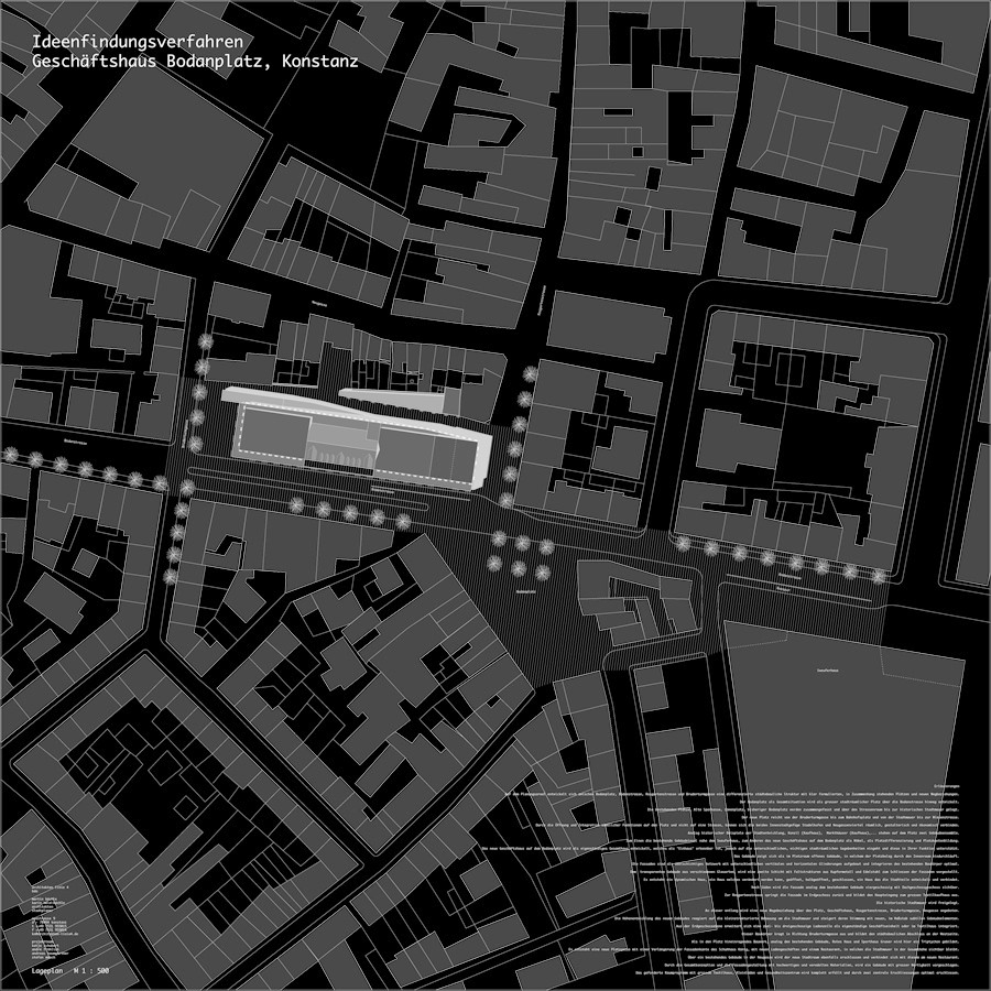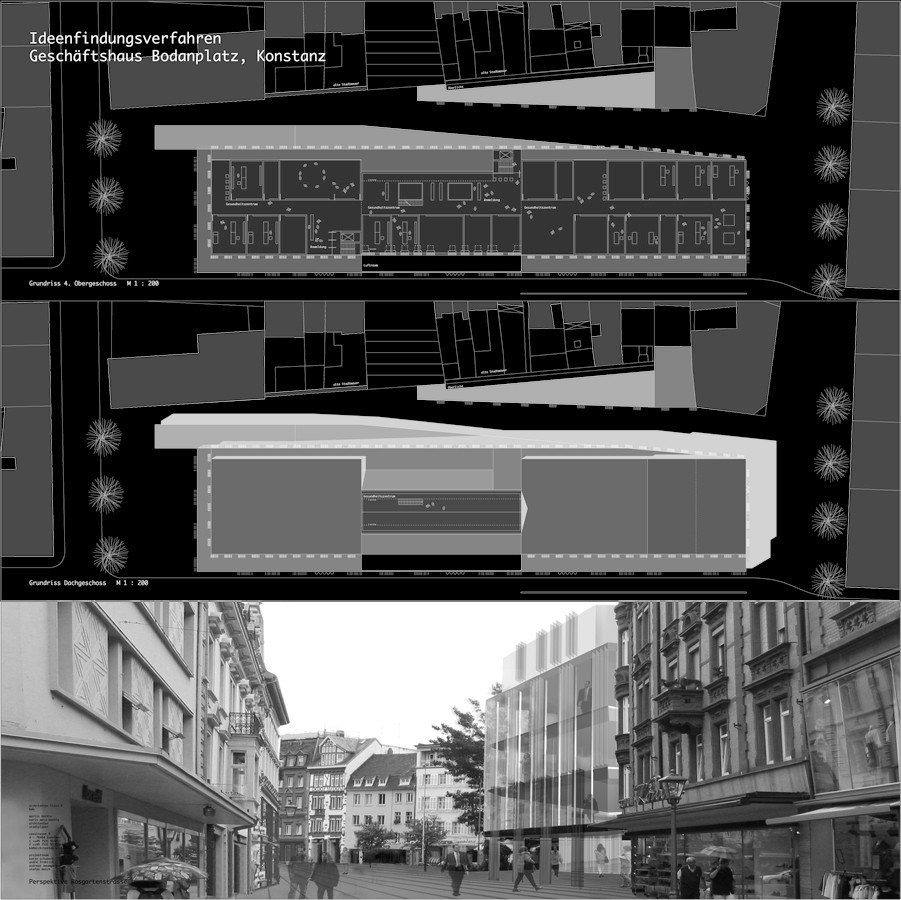 Auf dem Planungsareal entwickelt sich zwischen Bodanplatz, Bodanstrasse, Rosgartenstrasse und Bruderturmgasse eine differenzierte städtebauliche Struktur mit klar formulierten, in Zusammenhang stehenden Plätzen und neuen Wegbeziehungen. Der Bodanplatz als Gesamtsituation wird als grosser stadträumlicher Platz über die Bodanstrasse hinweg entwickelt. Die bestehenden Plätze, Alte Sparkasse, Löwenplatz, bisheriger Bodanplatz werden zusammengefasst und über den Strassenraum bis zur historischen Stadtmauer gelegt. Der neue Platz reicht von der Bruderturmgasse bis zum Bahnhofsplatz und von der Stadtmauer bis zur Wiesenstrasse. Durch die Öffnung und Integration sämtlicher Funktionen auf den Platz und nicht auf eine Strasse, können sich die beiden Innenstadtgefüge Stadelhofen und Neugassenviertel räumlich, gestalterisch und ökonomisch verbinden. Analog historischer Beispiele der Stadtentwicklung, Konzil (Kaufhaus), Markthäuser (Kaufhaus),... stehen auf dem Platz zwei Gebäudeensemble. Zum Einen die bestehende Gebäudeinsel nahe dem Seeuferhaus, zum Anderen das neue Geschäftshaus auf dem Bodanplatz als Möbel, als Platzdifferenzierung und Platzkantenbildung. Das neue Geschäftshaus auf dem Bodanplatz wird als eigenständiges Gesamthaus entwickelt, welches als "Einhaus" erkennbar ist, jedoch auf die unterschiedlichen, wichtigen stadträumlichen Gegebenheiten eingeht und diese in Ihrer Funktion unterstützt. Das Gebäude zeigt sich als im Platzraum offenes Gebäude, in welchem der Platzbelag durch den Innenraum hindurchläuft. Die Fassaden sind als zweischichtiges Netzwerk mit unterschiedlichen vertikalen und horizontalen Gliederungen aufgebaut und integrieren den bestehenden Baukörper optimal. Dem transparenten Gebäude aus verschiedenen Glasarten, wird eine zweite Schicht mit Faltstrukturen aus Kupfermetall und Edelstahl zum Schliessen der Fassaden vorgestellt. Es entsteht ein dynamischen Haus, ein Haus welches verändert werden kann, geöffnet, halbgeöffnet, geschlossen, ein Haus das die Stadtteile entwickelt und verbindet. Nach Süden wird die Fassade analog dem bestehenden Gebäude viergeschossig mit Dachgeschossgeschoss sichtbar. Zur Rosgartenstrasse springt die Fassade im Erdgeschoss zurück und bildet den Haupteingang zum grossen Textilkaufhaus aus. Die historische Stadtmauer wird freigelegt. An dieser entlang wird eine neue Wegebeziehung über den Platz, Geschäftshaus, Rosgartenstrasse, Bruderturmgasse, Neugasse angeboten. Die Höhenentwicklung des neuen Gebäudes reagiert auf die kleinstrukturierte Bebauung um die Stadtmauer und steigert deren Stimmung mit neuen, im Maßstab subtilen Gebäudeelementen. Aus der Erdgeschossebene erweitert sich eine zwei- bis dreigeschossige Ladenzeile als eigenständige Geschäftseinheit oder im Textilhaus integriert. Dieser Baukörper kragt in Richtung Bruderturmgasse aus und bildet den städtebaulichen Abschluss an der Westseite. Als in den Platz hineinragendes Bauwerk, analog den bestehenden Gebäude, Rotes Haus und Sporthaus Gruner wird hier ein Triptychon gebildet. Es entsteht eine neue Platzgasse mit einer Verlängerung der Fassadenkante des Schuhhaus König, mit neuen Ladengeschäften und einem Restaurant, in welchen die Stadtmauer in der Gesamthöhe sichtbar bleibt. Über ein bestehendes Gebäude in der Neugasse wird der neue Stadtraum ebenfalls erschlossen und verbindet sich mit diesem am neuen Restaurant. Durch die Gesamtkonzeption und die Fassadengestaltung mit hochwertigen und veredelten Materialien, wird ein Gebäude mit grosser Wertigkeit vorgeschlagen. Das geforderte Raumprogramm mit grossem Textilhaus, Kleinläden und Gesundheitszentrum wird komplett erfüllt und durch zwei zentrale Erschliessungen optimal erschlossen.