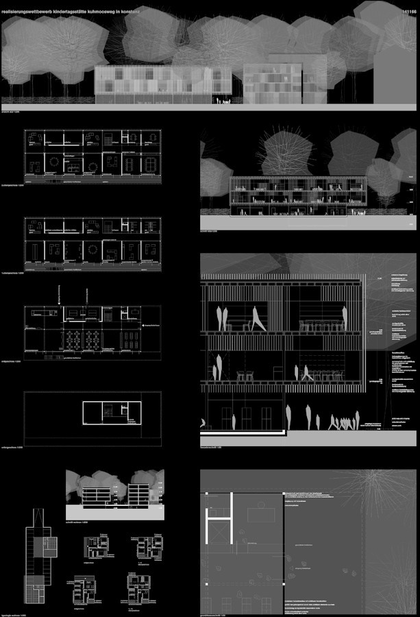 die umgebungsbebauungen des zu beplanenden grundstücks werden von unterschiedlichen städtebaulichen baustrukturen und ansätzen des wohnungsbaus der vergangenen jahrzehnte geprägt. parallel gestellte wohnungsstrukturstangen und die ansätze, wohnungsbau in kleinmaßstäbliche gebäudeteile aufzulösen, wechseln sich ab. der ort der neubebauung zwischen kuhmoosweg und danzigerstraße in konstanz zeichnet sich durch eine große, inselartige parkfläche mit großbäumen aus. die zu bebauende fläche grenzt sich zu den nachbarflächen ab, bietet eine angenehme massivität von grün und ist ein wunderbarer aufenthaltsort für menschen und kleintiere. der städtebauliche ansatz folgt der parkidee und stellt drei neue gebäude, die kindertagesstätte und zwei wohnungsgebäude, so in den park hinein, dass diese von den vorhandenen baumriesen ummantelt werden können und sich zurückhaltend dezent präsentieren. die kindertagesstätte wird in modularem holzrahmenbau über alle geschosse in einem durchlaufenden raster konstruiert, mit verglasungen und umlaufenden vertikalen holzstrukturen (schiebeelemente) mit rundstäben, analog zu den vorherrschenden baumstrukturen, umhüllt. im gesamten gebäude sind die holzmaterialien sichtbar und geben dem haus eine geborgenheit im gebäude und im park. die wohnungsgebäude werden in stahlbeton konstruiert, mit verglasungen mit umlaufenden vertikalen, filigranen gitterroststrukturen (schiebeelemente) aus ökologischem recyclingaluminium bronze eloxiert umhüllt. durch zwei in ihrer anmutung ähnliche und im detail unterschiedliche fassaden werden die nutzungen lesbar, die baukörper bleiben durch ihre geschosshohen schiebeelemente vielfältig und werden sich in die parklandschaft eingruppieren, ohne an selbstständigkeit zu verlieren. um die der baumlandschaft widersprechende horizontalität zu vermeiden, werden die baukörper in verschiedenen höhen und somit verschiedenen geschossigkeiten entworfen. die III, IV und V geschossigen bausteine bleiben unterhalb der traufkante der nachbarbebauung und bilden aus der höhenentwicklung einen städebaulichen abschluss, vom geschosswohnen der 50er und 60er jahre zum westlichen landschaftsraum.