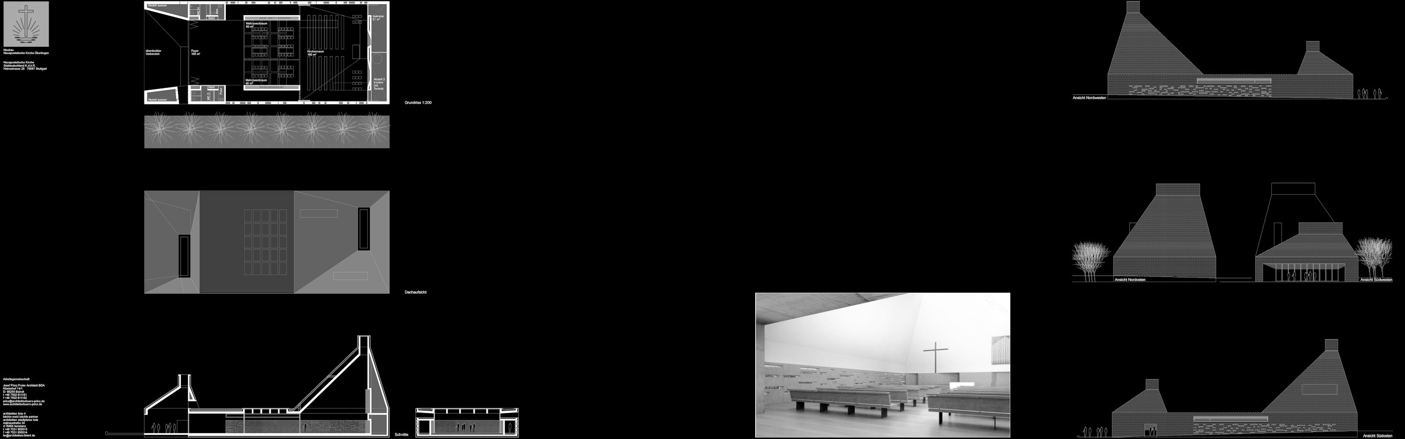 Über den maßstäblichen geschützten Vorbereich gelangt man zum überdeckten Vorbereich. Das Gebäude wird durch das Foyer betreten. Die mittig eingefügten beiden Mehrzweckräume gliedern den Raum, der Weg in den Kirchenraum führt durch die seitlichen zwei äGnge mit diffusem Licht. Das durchschreiten der leicht dunkleren, niedrigen äGnge steiget die Wahrnehmung und Wirkung beim Betreten des überhöhten, lichtdurchflutenden Kirchenraumes. Verschiedene Raumzusammenhänge lassen sich verwirklichen und bieten eine größtmögliche Flexibilität, jeweils mit hoher architektonischer Innenraumqualität. Der Kirchenraum bietet durch die entsprechende indirekte aber intensive Lichtführung mit den tiefen Oberlichtöffnungen und dem diffusen Licht der perforierten Wände ein interessantes und doch ein sehr klares, ein dezent dramatisches und dennoch ein ruhiges Innenraumerlebnis. Die beiden zusammenschaltbaren Mehrzweckräume werden mit einer natürlichen Oberlichtdecke belichtet, durch seitliche Lichtbänder be- und entlüftet.