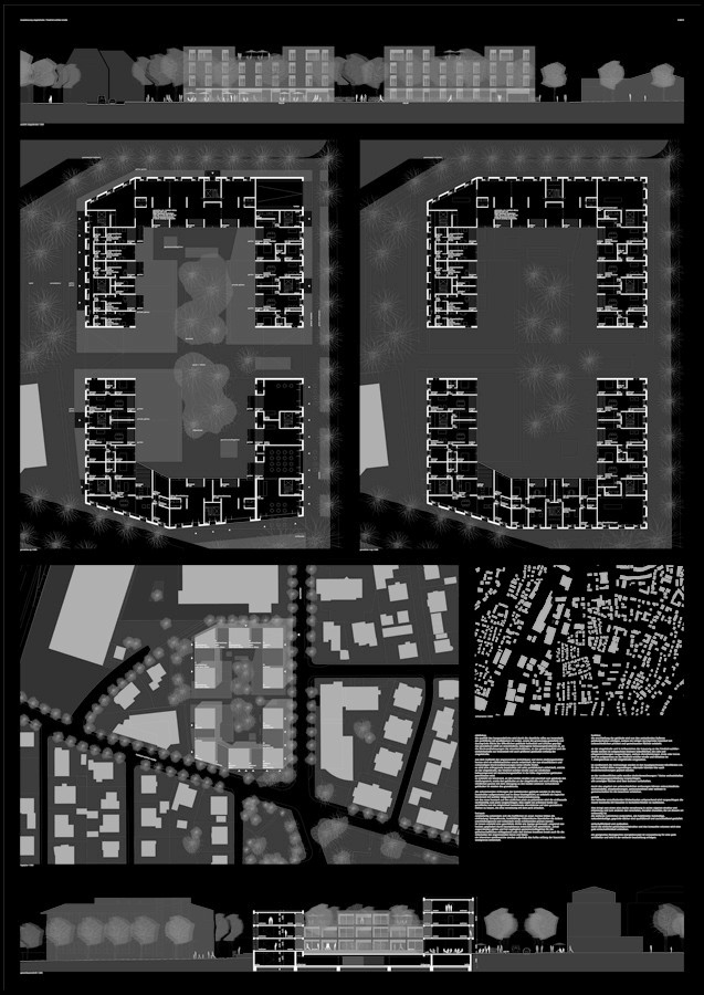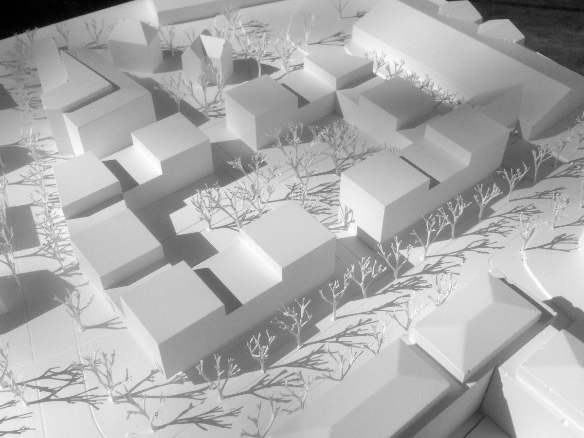 die qualität des baugrundstücks wird durch die räumliche nähe zur innenstadt, der parkfläche mit großbäumen im süden, sowie die grosszügig gestaltete und durchgrünte fläche der öffentlichen gebäude hallenbad und schulen geprägt. das grundstück stößt an verschiedene, heterogene bebauungsstrukturen an, an die blockrandbebauungen der einzelwohnhäuser, an das gewerbegebiet und die einfahrtsstraße zur innenstadt mit auch größeren gebäuden entlang der ziegelstraße. aus dem maßstab der angrenzenden wohnhäuser und deren siedlungsstruktur heraus wird ein städtebaulicher ansatz entwickelt, der aus einzelhäusern und notwendigen blockrandbebauungen seine inhalte findet. es wird eine orthogonale baustruktur mit zehn punkthäusern entwickelt, welche an der ziegelstraße, der friedrich-schiller-straße und am nördlichen bebauungsrand mit dazwischengestellten in der höhe abgesetzten gebäuden geschlossen wird. es entsteht ein blockrand, an den beiden straßen mit anschluß zum gebäude des siedlungswerk, sowie den gebäudes an der ziegelstraße und auch entlang der nördlichen grenze mit dem übergang zu den beiden weiteren vorhandenen gebäuden im westen des grundstücks. die ankommenden richtungen der bestehenden gebäude werden in die neue baustruktur aufgenommen und in diese hineingeführt, so entsteht ein logischer blockrand mit subtiler integration der bestandsbebauung. um das neue bauwerk auf den südlichen platz zu präzisieren wird die südfassade rechtwinklig zum platz vorgeschlagen, dies ergibt ein präzisere kante zur grünfläche und die möglichkeit bestehende ahornbäume auf dem grundstück stehen zu lassen, die eine vernetzung mit dem park erlauben.