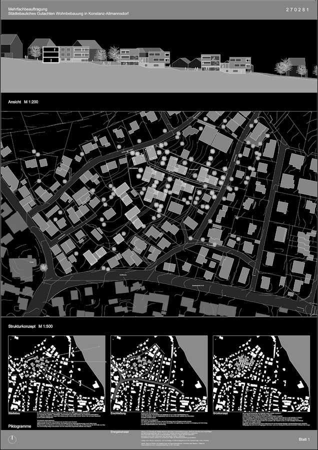 Ziel ist es,dieTopographie des Geländes wieder sichtbar zumachen. In den Wiesenhang werden die Baukörper integriert. Entsprechend der Hangneigung werden Streuobstbestände eingefügt. Durch Bündelung der Höhenlinien entstehen geneigte Hangterrassen,die bis an die Gebäude hin fließen. Das integrierende Thema der Wohnanlage ist der Wiesenhang, der auch den Charakter bestimmt. Lediglich ein Erschließungsweg windet sich zwischen den Häusern durch, um die fußläufige Erschließung so reduziert als möglich zuhalten. Zugunsten der Gesamtwirkung wird auf den Einschnitt von freiräumlich flächigen Gemeinschaftsanlagen verzichtet, Wertgelegt wird auf einen durchgängigen Grünraum und einen ökologisch/naturhaft reduzierten Charakter der Anlage.