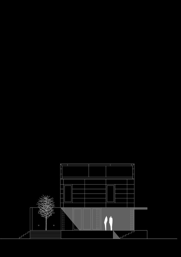 in das konzept einer siedlungsbebauung der 50er jahre wird das haus reiner als murales gebäude integriert und aus diesem entwickelt. sockelausbildung, quadratischer grundriss im erdgeschoss, materialtrennung in der fassade von erdgeschoss zu obergeschoss, firstbetonung, windschutzelemente, sind die prägenden bausteine der bestehenden siedlung und des neuen gebäudes, welches in seinem formalen ausdruck und in bezug auf raum bearbeitet wurde. auf dem bestehenden keller wird das neue gebäude geplant. es werden drei baukörper gebildet , den sockel aus schwarzem schiefer als plateau, erhobene basisfläche mit den treppenausschnitten in das gelände hinein, die erdgeschosspange aus sichtbeton, als wandelemente zur strasse mit nebenräumen und das gebäudeteil mit oberlicht das obergeschoss aus travertin, welches in die gartenfläche hinaus ragt. Im kern der drei baukörper ensteht der eigentliche wohnraum und die terrasse als grundfläche, beschützt und doch offen. die innenräume folgen der konzeption, sodaß im erdgeschoss funktionen und räume entstehen die sich über die basis hinweg in den garten öffnen. und im obergeschoss neben einer gemeinsamen fläche, einzelne räume angeboten sind.