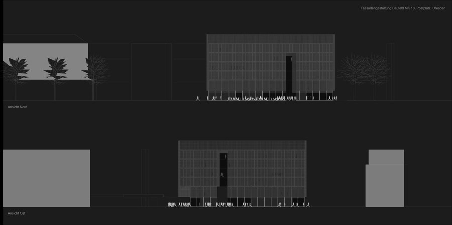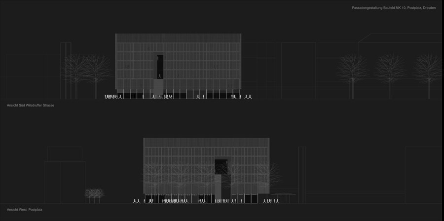 Der Standort des vorgesehenen Projektes "Wilsdruffer Tor" liegt in prominenter Lage am Postplatz, in unmittelbarer Nachbarschaft zum Zwinger in Dresden. Der neue Kubus wird nicht in Einzelbaukörper unterteilt, sondern als zusammenhängendes Gehäuse mit unterschiedlichen Öffnungen in die Stadträume hinein entworfen. Für das Gebäude wird eine doppelschichtige Fassade entwickelt. Das äüssere Erscheinungsbild wird in Anlehnung an die historischen Fassaden und der Übertragung in zeitgenössische Architektur mit einer halbtransparenten Hülle aus Terracotta verkleidet. Kleinformatige, vertikale Terracottastäbe – Baguettes prägen das komplette Gebäude zurückhaltend in den Ansichten, sowie in der Dachaufsicht. Das Gebäude erscheint als ruhiger, sandfarbener und aufgelockerter Kubus, durch welchen das Innenleben der zweiten Fassade aus Glas durchscheint. Diese zweite Fassade , thermische Haut" wird in einem Abstand von ca. 60cm komplett aus Glas vorgeschlagen. Durch den Einsatz von verschiedenen Verglasungen und Glasarten werden alle unterschiedlichen Funktionen gelöst. Raumhohe Schiebeelemente, raumhohe DrehKippflügel, transparente oder mattierte Brüstungen... können in die Struktur integriert werden. Als Gesamtkubus entsteht eine geschichtete Fassade. In der Tagansicht erscheint aus der Ferne die Terracottafassade prägend, aus der Nahansicht lässt die Terracottafassade Raum und Durchsicht für das gläserne Gebäude und deren Inhalte. In der Nachtansicht können durch die Schichtungen unterschiedliche Lichtstimmungen im Stadtraum, im Zwischenraum und im Innenraum erzielt werden. Der Kubus wird durch unterschiedliche Öffnungen in den Fassaden gegliedert, lässt jedoch den Gesamtkubus unzerstört. Zur Wilsdruffer Straße wird der Strassenraum durch das neue Gebäude begrenzt, es entsteht ein großes Tor mit Durchgang zum Postplatz, das Wilsdruffer Tor. Durch eine präzise, disziplinierte Umsetzung des Konzepts wird ein hervorragendes Gebäude entstehen, welches großen Respekt vor den historisch bedeutsamen Bauwerken zeigt und eine eigene moderne Architektursprache für Dresden spricht.