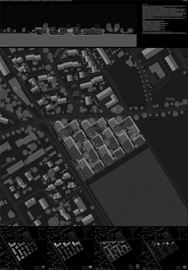 im wohnquartier werden unterschiedlichste gebaeude- und wohnformen angeboten. zur bahn laubengangtypologien, analog der der kirchhofener straße, im innenquartier punkthaeuser, haeuser mit mittelerschließung und schlafraeumen nach ost- und west, dies in unterschiedlich breiten konstruktionsachsen. die bauwerke entlang der kirchhofener straße sind dem gefoerderten mietwohnen vorbehalten, die innenquartiere dem freien wohnungsbau.